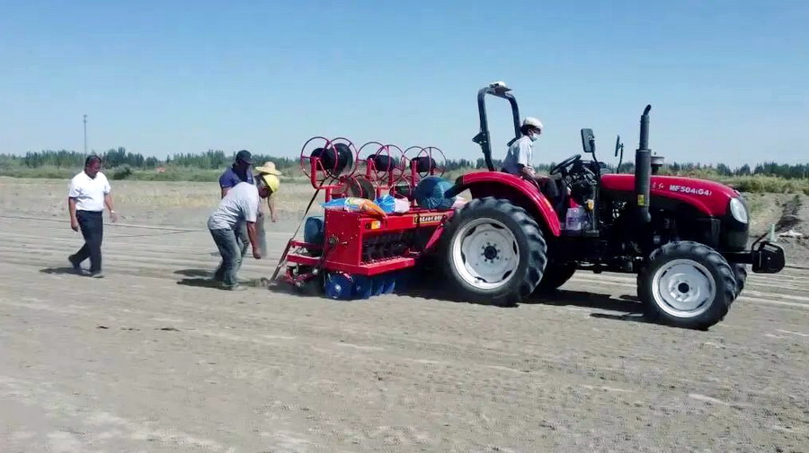 在岳普湖县巴依阿瓦提乡柳树王村的小麦种植现场,,,,装有北斗终端的大马力拖拉机正按照预先设定的播种线路精量播种小麦。。整地、、、施肥、、、播种,,,,整个种植过程紧张有序,,,现场一派繁忙景象...