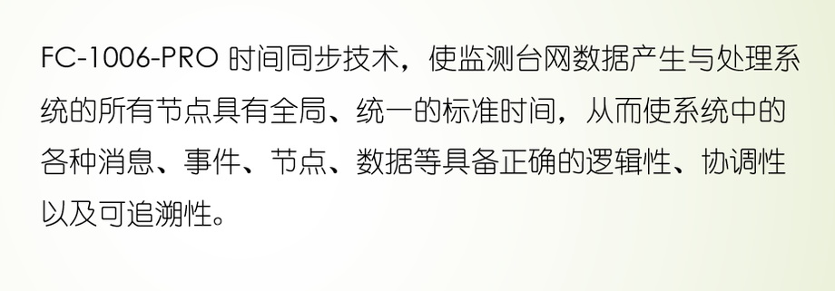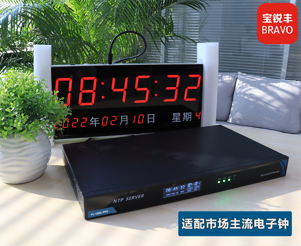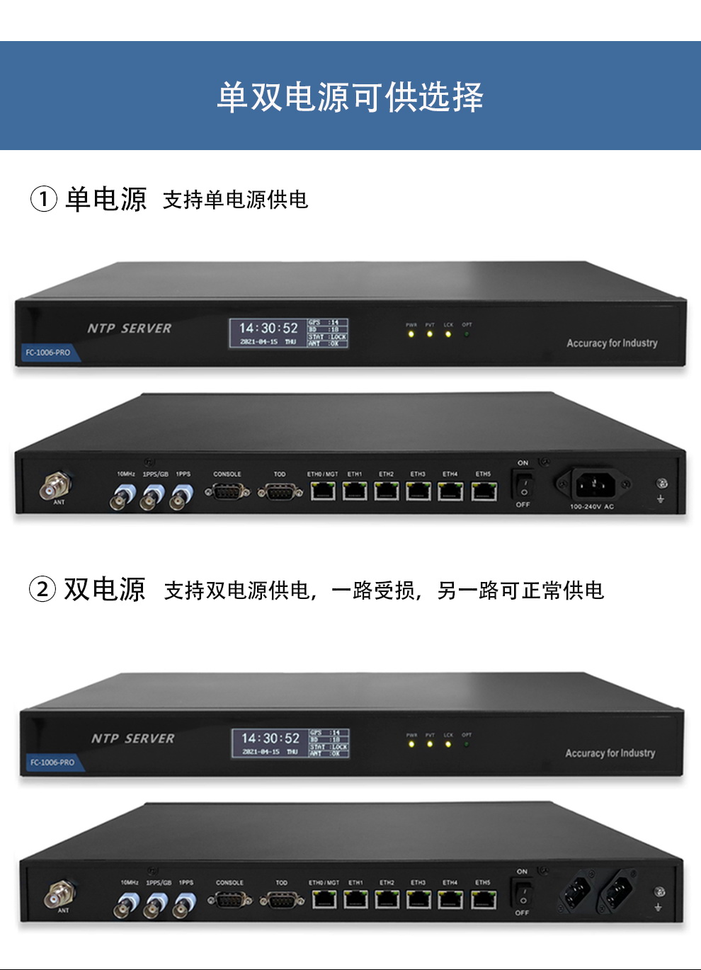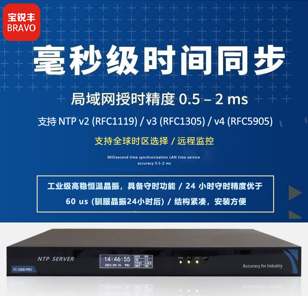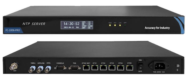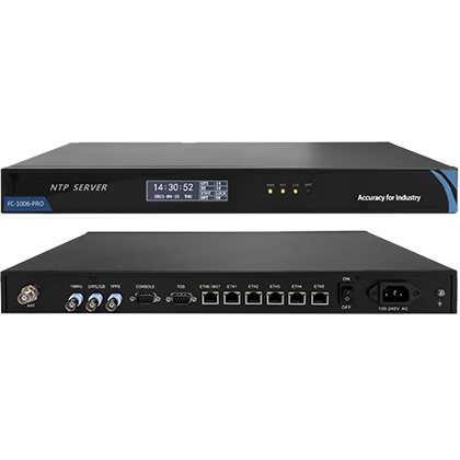 FC-1006-PRO 是一款基于 NTP v3 / v4 协议的专业级网络时间服务器,,前面板带 OLED 高清液晶显示屏,,,,内置工业级恒温晶振,,具备守时功能,,,可部署于有更高要求的严苛应用环境;支持远程监控和全球时区选择功能,,,,满足国际用户多样化应用场景;设备持续向网络中的联网设备提供毫秒级时间同步服务,,主要应用于机场、、高速公路、、、自动驾驶、、银行、、、电力、、、工厂自动化控制等领域。。